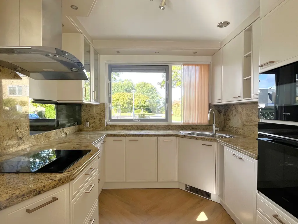 De open luxe keuken is voorzien van alle apparatuur voor dagelijks comfort, o.a.: een mooi natuurstenen werkblad rondom, een fraaie inductie kookplaat, multifunctionele oven, combi microwave, vaatwasser, koelkast vries combinatie (no frost) en combi-Quooker.