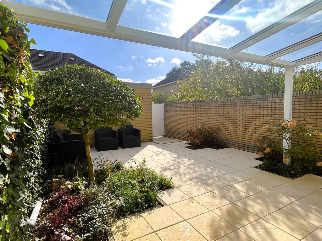 De schuifpui geeft toegang tot de heerlijke zonnige achtertuin (ca. 54 m²). Echt genieten. Deze tuin is lekker ruim, keurig betegeld en heeft een achterom. Deze beschikt ook over een mooi aangebouwde overkapping voor een beetje schaduw met op afstandbediening bestuurbare sunscreens. Verder een stenen schuur voor uw fietsen, etc.