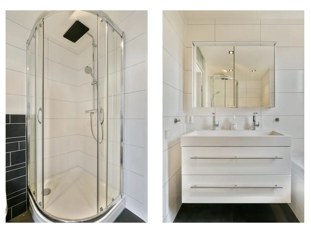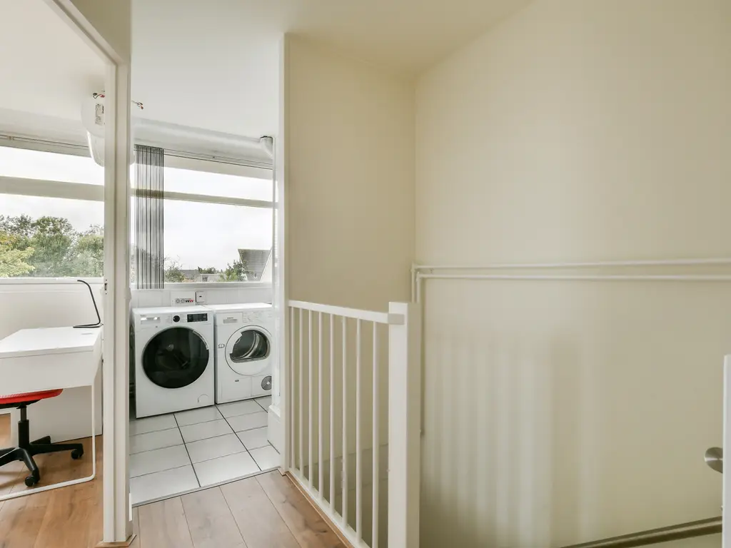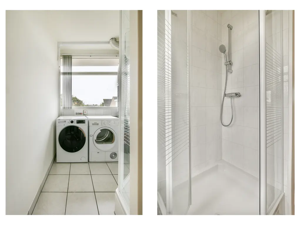 Verder nog een bescheiden badkamer met opstelling wasmachine en droger. Hier bevindt zich ook de opstelling van de cv-ketel en mechanische ventilatie.